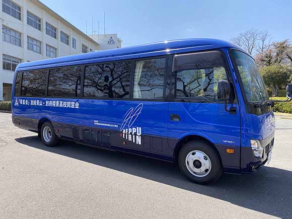 旧別府青山高校同窓会と別府翔青高校同窓会を統合しスタートした青藍会として同窓会費の有効活用について検討していましたが、生徒の移動用に使用していたバスが30年近くを経過したものであり、エアコンが効かないなどの不具合や修理代も毎年かなり負担になっているなどの現状を踏まえ学校と相談した結果、別府市別府競輪地域振興事業補助金を活用し、バスを新車で購入しました。